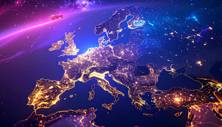 A vibrant nighttime view of Europe from space, with cities glowing brightly and a cosmic nebula in the background.