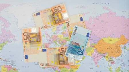 Euros at world map, Euro banknote on the Europe map. Concept for Eurozone, European economy, stock market in EU,