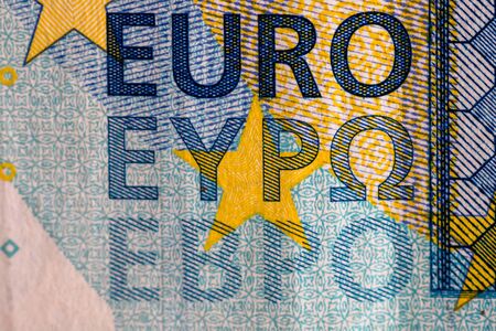 Selective focus on detail of euro banknotes. Close up macro detail of money banknotes, 20 euro isolated. World money concept, inflation and economy concept