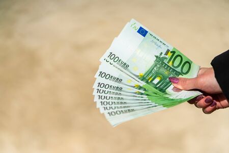 Woman hand holding and giving money. World money concept, close up of 100 EURO banknote, photo of EUR currency isolated. Hand holding money, EURO currency
