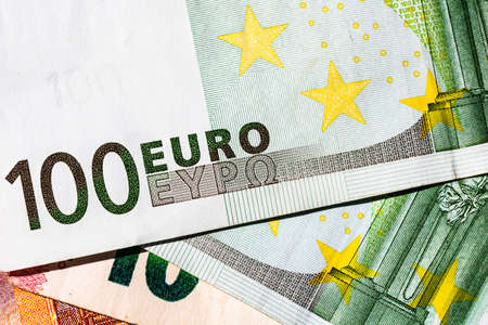 Selective focus on detail of euro banknotes. Close up macro detail of money banknotes, 100 euro isolated. World money concept, inflation and economy concept