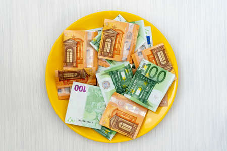 Euro currency money. Cash money, euro bills. Stacks of Euro notes on concrete background in five hundred, two hundreds, one hundreds and fifties. Copyspace for text.
