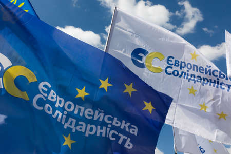 KYIV, UKRAINE - Jul. 01, 2020: Rally against political persecution in Ukraine. Thousands of people came to support 5th President of Ukraine Petro Poroshenko. Flags of the European Solidarity Party