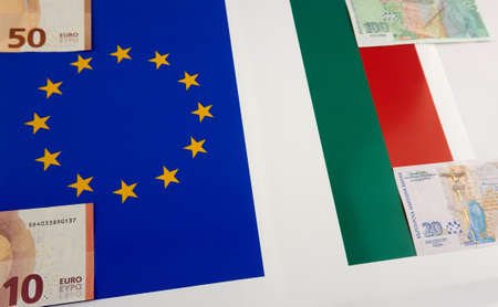Bulgarian and European Union banknotes in front of EU and Bulgarian flag