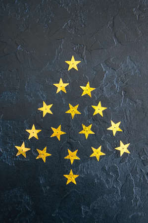 Christmas tree from golden stars over black stone background. Toned. Copy space.