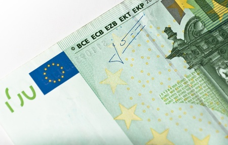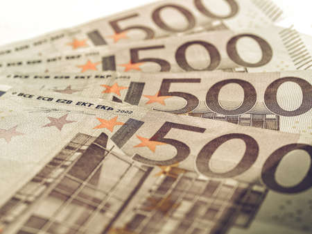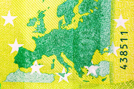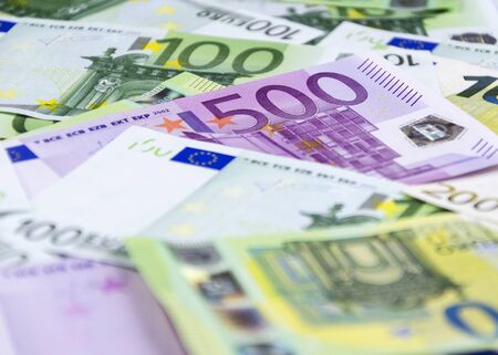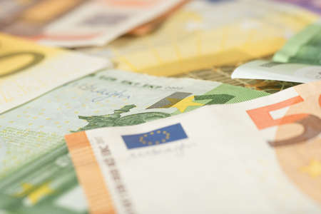 Selective focus on detail of EURO banknotes. Close up macro detail of EURO banknotes. World money concept, inflation and economy concept