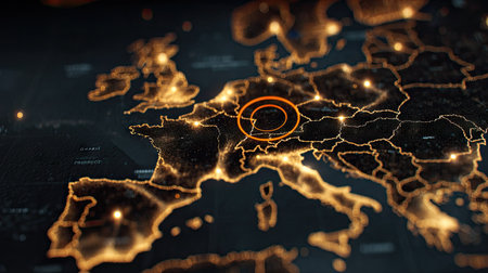 An illuminated map of Europe is displayed against a dark background, featuring glowing nodes that highlight various regions. The image showcases data visualization elements, with a focus on interconnectedness. The visual characteristics include glowing orange tones and a soft focus, suitable for diverse uses.