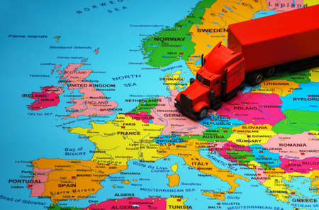 Red truck with trailer on the Europe map.