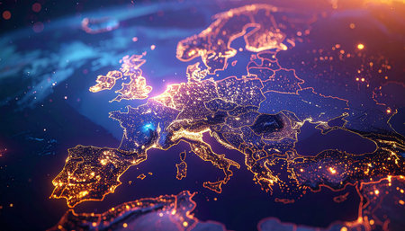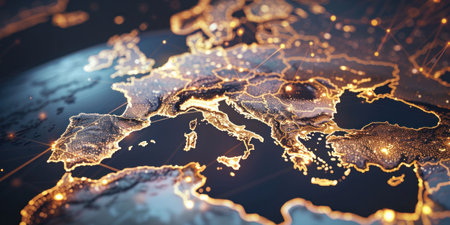 The continent of Europe is presented as a glowing map at night, with illuminated cities and borders against a deep...