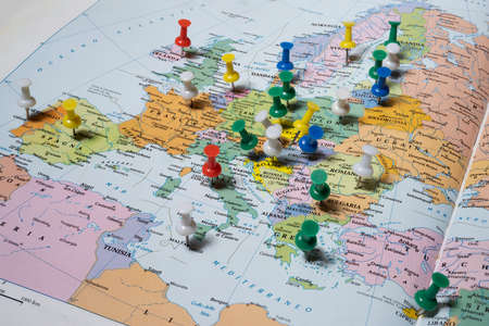 European capitals marked with colored pins on an atlas