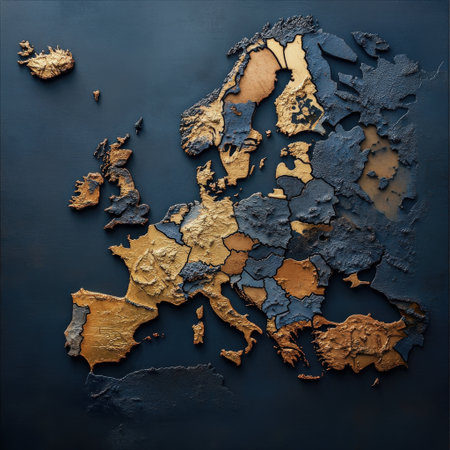 Textured map of Europe featuring national flags, illustrating cultural diversity and unity, with vibrant colors and intricate details enhancing the visual appeal