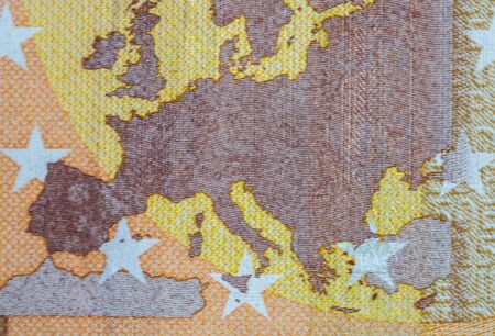 Close-up shot of Europe's map displayed on Euro banknote