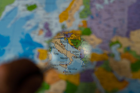 colorful view of italy magnified with a magnifying glass, blurred background