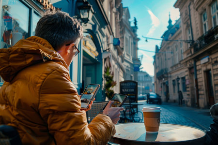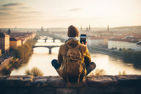 A person taking a picture of a city with a cell phone. Generative AI.