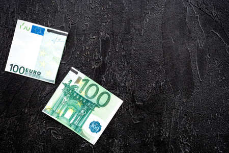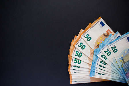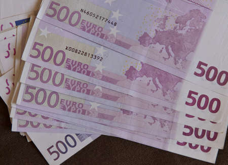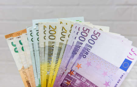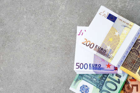 Euro currency money. Cash money, euro bills. Stacks of Euro notes on concrete background in five hundred, two hundreds, one hundreds and fifties. Copyspace for text.