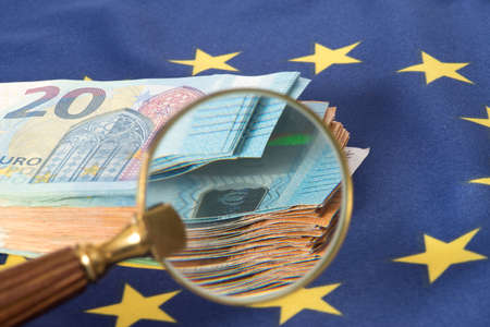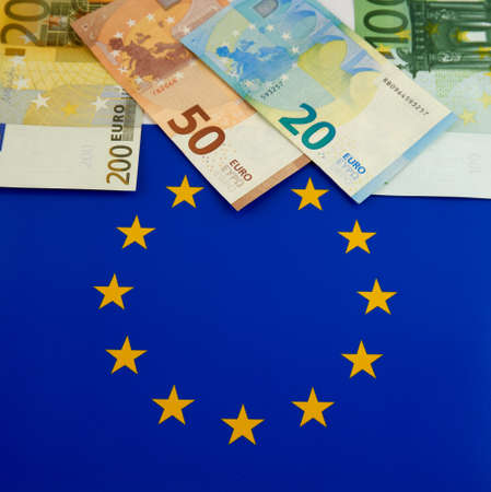 European Union flag with US dollars as background. Concept for investors, soft focus