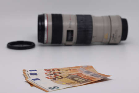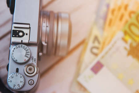 Camera, money, glasses, lens and Travel concept image: traveler accessories. Earnings on photo stocks