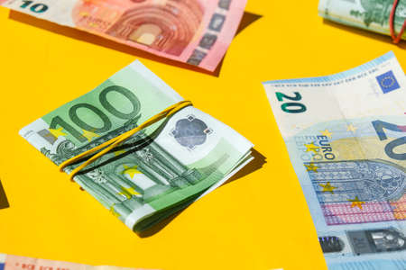 Close up of Euro money roll. Euro banknote set cash money - EU currency. Rolled with rubber euro notes. Business budget of wealth and prosperity finance. Banknotes stacked on each other in different positions.