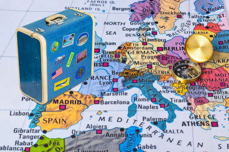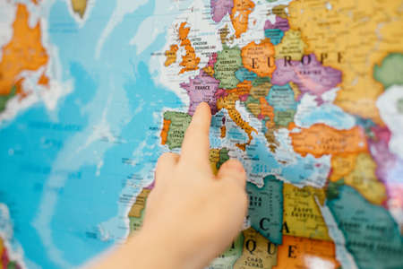 Toronto, Ontario, Canada - February 26, 2021: Human hand finger pointing out to Europe country on map. Travel dream destination. France country landmark on world global colorful map.
