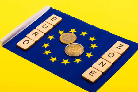 European union concept showing the flag of the EU on a yellow background with a sign reading Euro Zone with a one and two euro coin