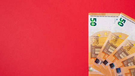Fragment of the 50 fifty euro banknote on a red background. Close up currency money with place for text copy space
