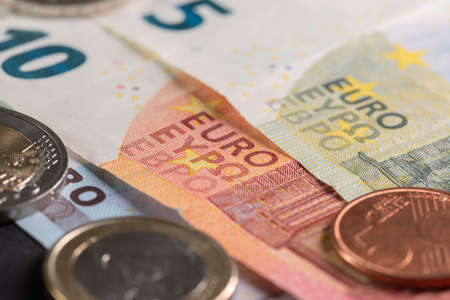 Pack of euro banknotes and coins background finance economy currency close up selective focus Europe currency