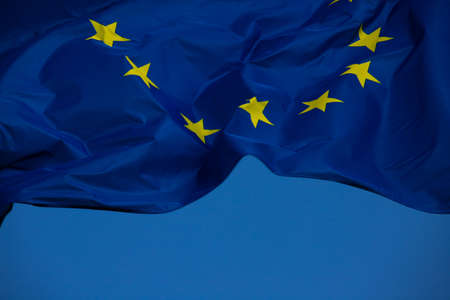European flag in the wind with a beautiful blue sky in the background. Place to place text