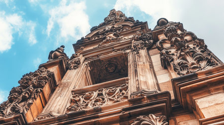 An ornate historical building with intricate stone carvings. Copy space on the sky background