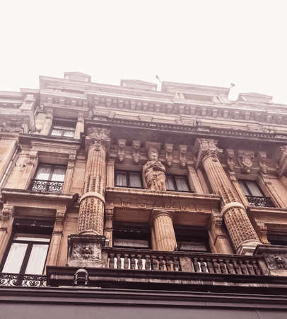 Picturesque vintage buildings downtown Madrid, Spain, Europe. Low angle view
