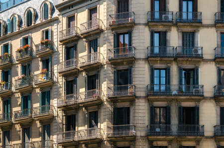 Geometric shapes of facade of modernist residential building with french balconies in Barcelona, Spain.