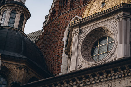 Round window with golden lattice, architectural details of Wawel Royal Castle, Krakow, Poland