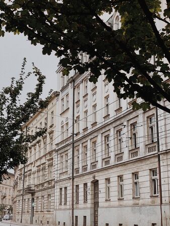 Kyiv, Ukraine 4 June 2025 Beautiful architecture of historic buildings in a European city with detailed facades and ornate balconies.Yellow white facade with multiple windows and balconies.