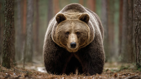 Bear walks through a clearing in a pine forest, showing its presence and role in Slavic culture as a symbol of protection and motherhood.