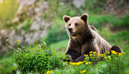 Majestic brown bear, ursus arctos, standing in greenery and observing surrounding. Wild animal in the nature from close up. Mammal in flowers from front view.
