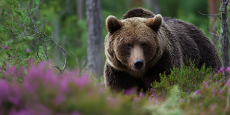 Brown bear stands in a lush scandinavian conifer forest, partially concealed by vibrant purple heather, gazing forward with a serious, powerful expression
