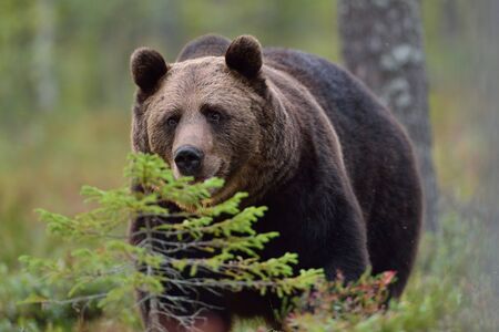 Wild adult Brown Bear Ursus Arctos in the summer forest.
