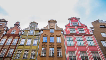 Gdansk, Poland - 12 April 2019; Fragment of colorful tenement houses in Gdansk, bottom view