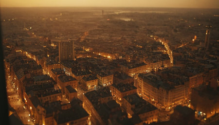 An aerial perspective reveals a densely packed European city as dusk settles, with thousands of lights illuminating buildings and streets. The warm glow of orange and yellow lights emanates from windows and streetlamps, creating a vibrant and energetic atmosphere. The intricate network of roads and rooftops is visible, showcasing the urban sprawl. The scene captures the transition from day to night, highlighting the city's lively character.