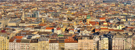 Picturesque panoramic aerial view of Vienna skyline, city building roofs under the sunlite with the view of high hills around Vienna