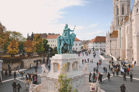 Budapest, Hungary - Nov 6, 2019: St. Stephen equestrian statue from behind. Tourists sightseeing on the square by the Fishermans Bastion in Hungarian capital city. Matthias Church in the background.