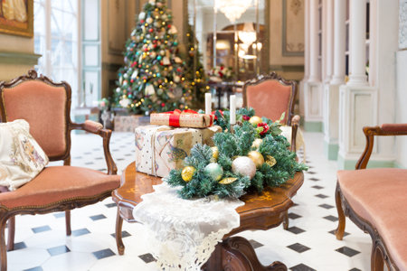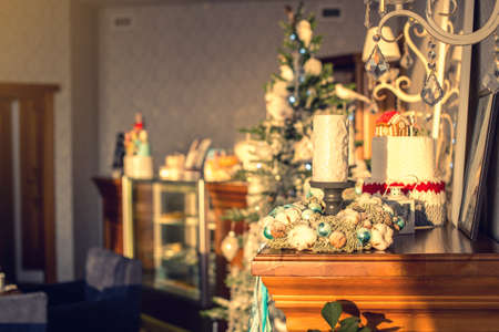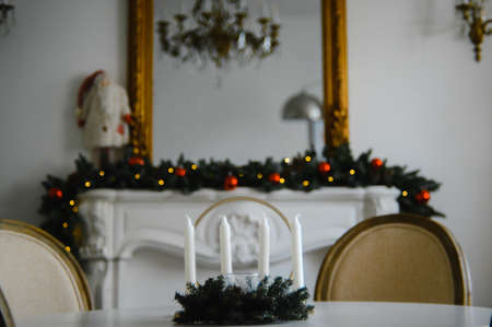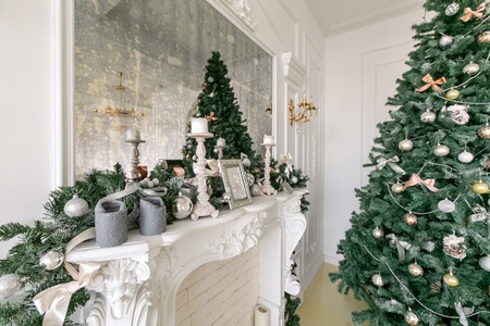 White fireplace decorated with candles and fir branches. Decorated Christmas tree. Classic apartments, morning in hotel