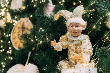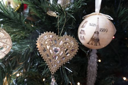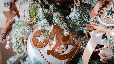 Beautiful Christmas decorations hanging on a Christmas tree. Home decoration for Christmas.
