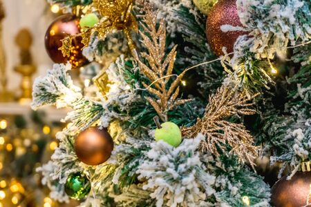 Decorated for Christmas or new year spruce, close-up of branches and toys on them