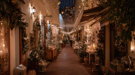 A beautifully decorated alleyway illuminated with twinkling lights, creating an inviting and festive setting for holiday shopping and gatherings. Experience the charm and warmth of the season.