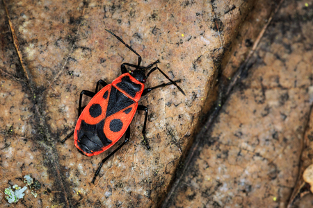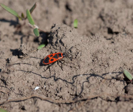 Red firebug crawls on ground in Leninskiy Rayon Brest Brest District Brest Region Belarus.