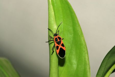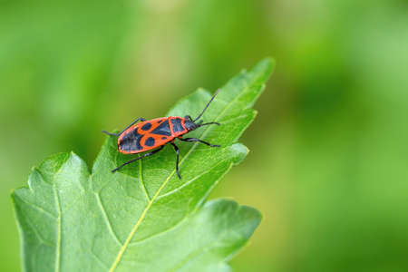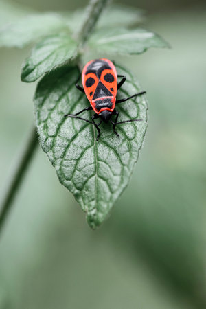 Natural closeup on the red firebug, Pyrrhocoris apterus sitting on a leaf in the garden.