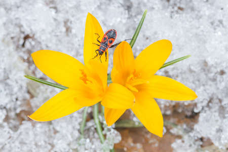 Firebug (Pyrrhocoris apterus) insect on the dandelion in the springtime