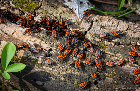 The firebug Pyrrhocoris apterus. Common insect of the family Pyrrhocoridae. Aggregation behavior of the large group of firebugs on the tree bark. Nature background. Top view. Close up. Selective focus