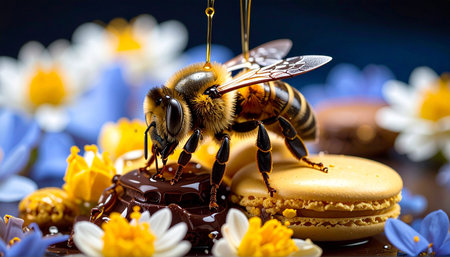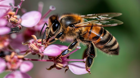 This stunning macro photography captures a honey bee intricately pollinating a beautiful flower, highlighting the crucial role of pollinators in our ecosystem.