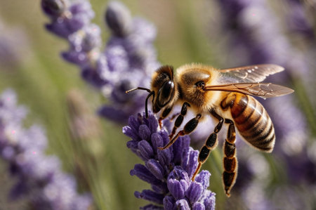A fuzzy honey bee diligently gathers pollen from a vibrant purple lavender blossom